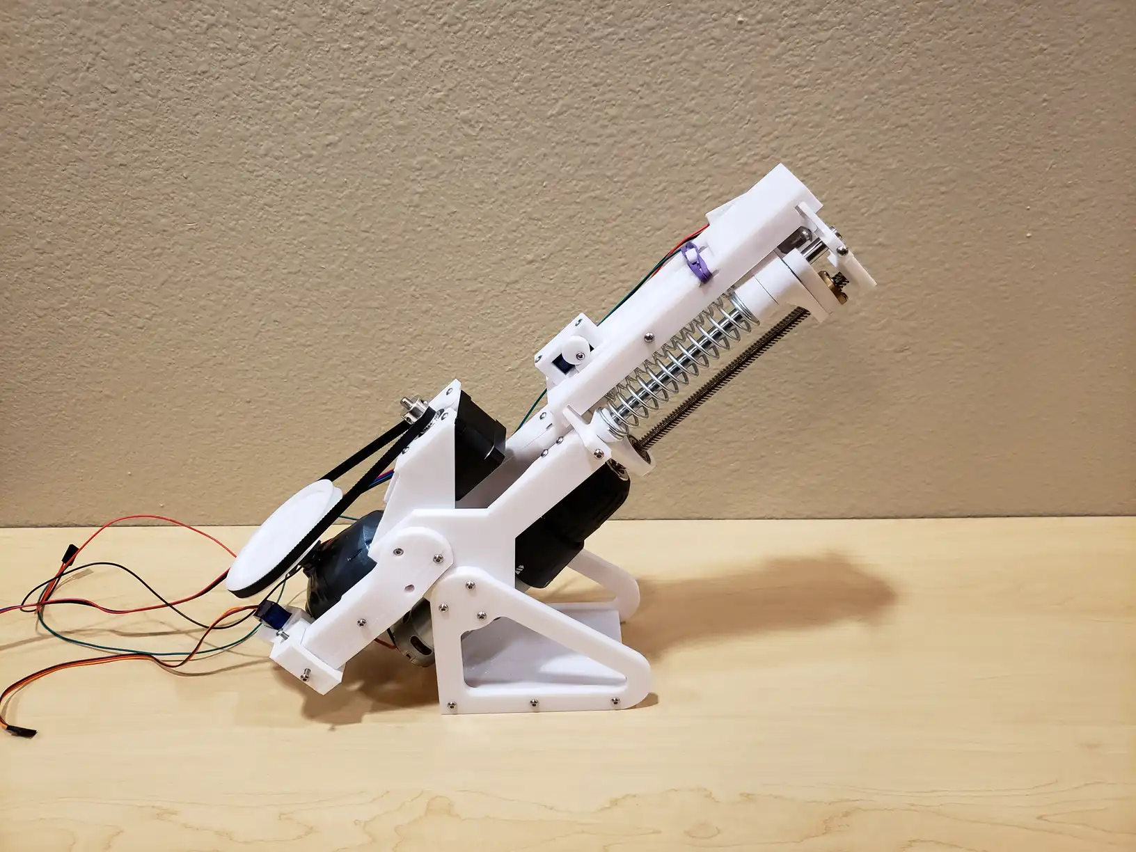 The next week or so resulted in the beginnings of a working launch mechanism. With the aid of a rubber band, a latching track was put under the rods and springs, such that the motor would tension the launching carriage, then return to the front of the mechanism to allow the eventual release of the catch using a servo. Soon after this, the motor was appropriately mounted to the frame, with a carefully fit 3D printed socket. It was, it seemed, all coming together.